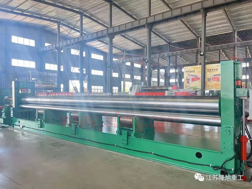 該卷板機屬于液壓型三輥卷板機,上輥可以通過液壓傳動垂直升降。下輥由電機、減速機帶動進行卷圓。由于下輥的標高不變,所以便于進料和操作。設備采用PLC可編程顯示器控制,運行平穩、靈活,無卡阻。該設備輥面還采用了鍍鉻工藝,更適合卷制不銹鋼罐體。
